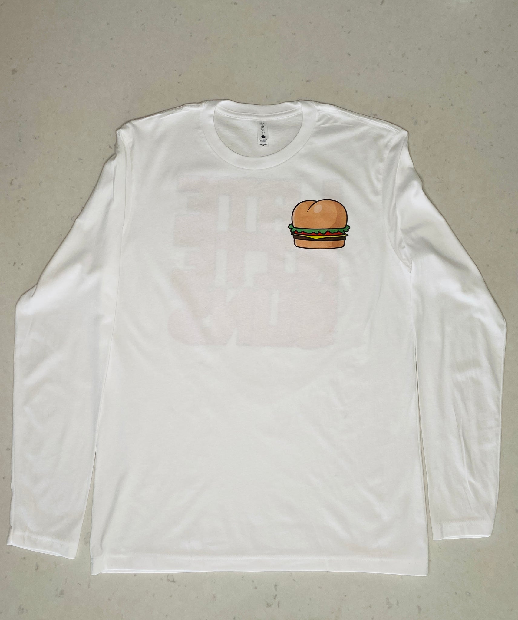 100% cotton White long sleeve shirt with burger on the front, and Late Nite Buns on the back.